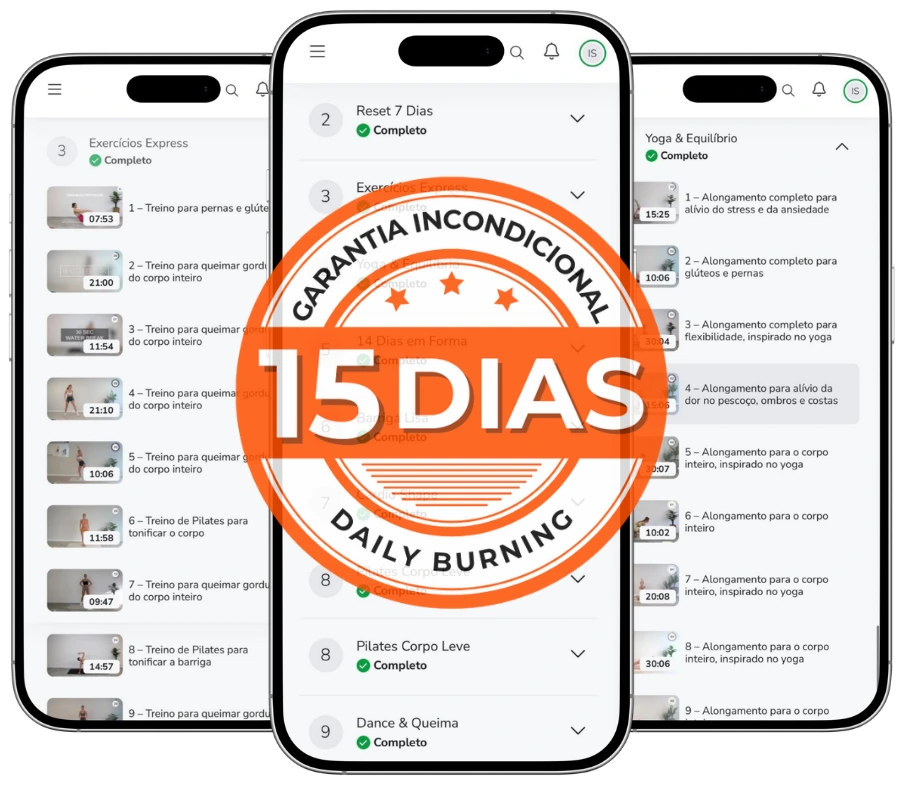 Fazer os exercícios em casa do Daily Burning é uma experiência única que só ao experimentares vais perceber porque mais de 82.703 pessoas já transformaram as suas vidas. Por isso, após a tua inscrição, tens 15 dias para experimentar.